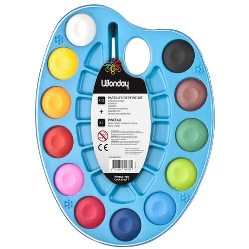 Témpera con colores densos. Caja de 12 pastillas de colores surtidos, forma rectangular o paleta. Viene con: 1 pincel.
