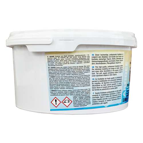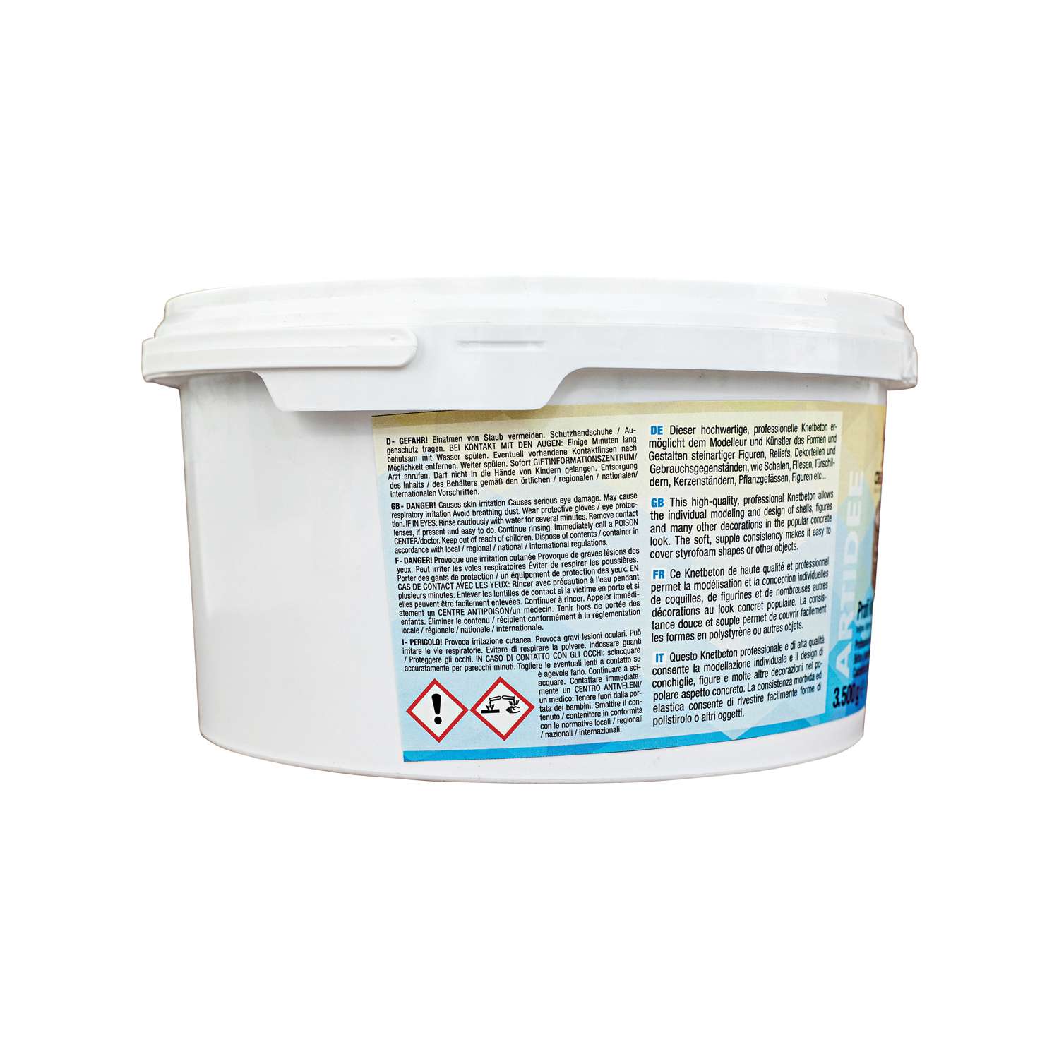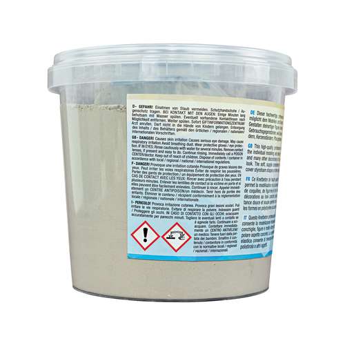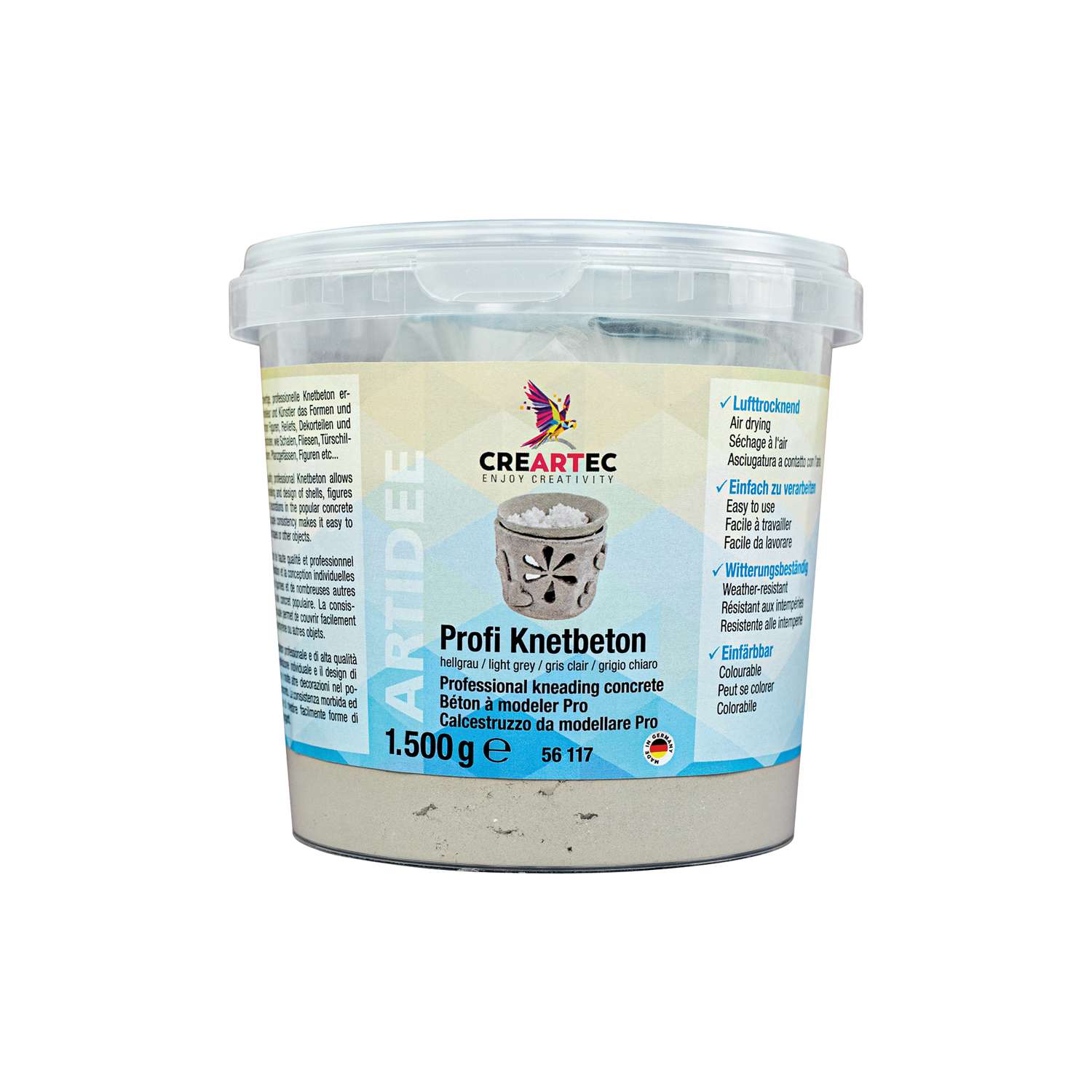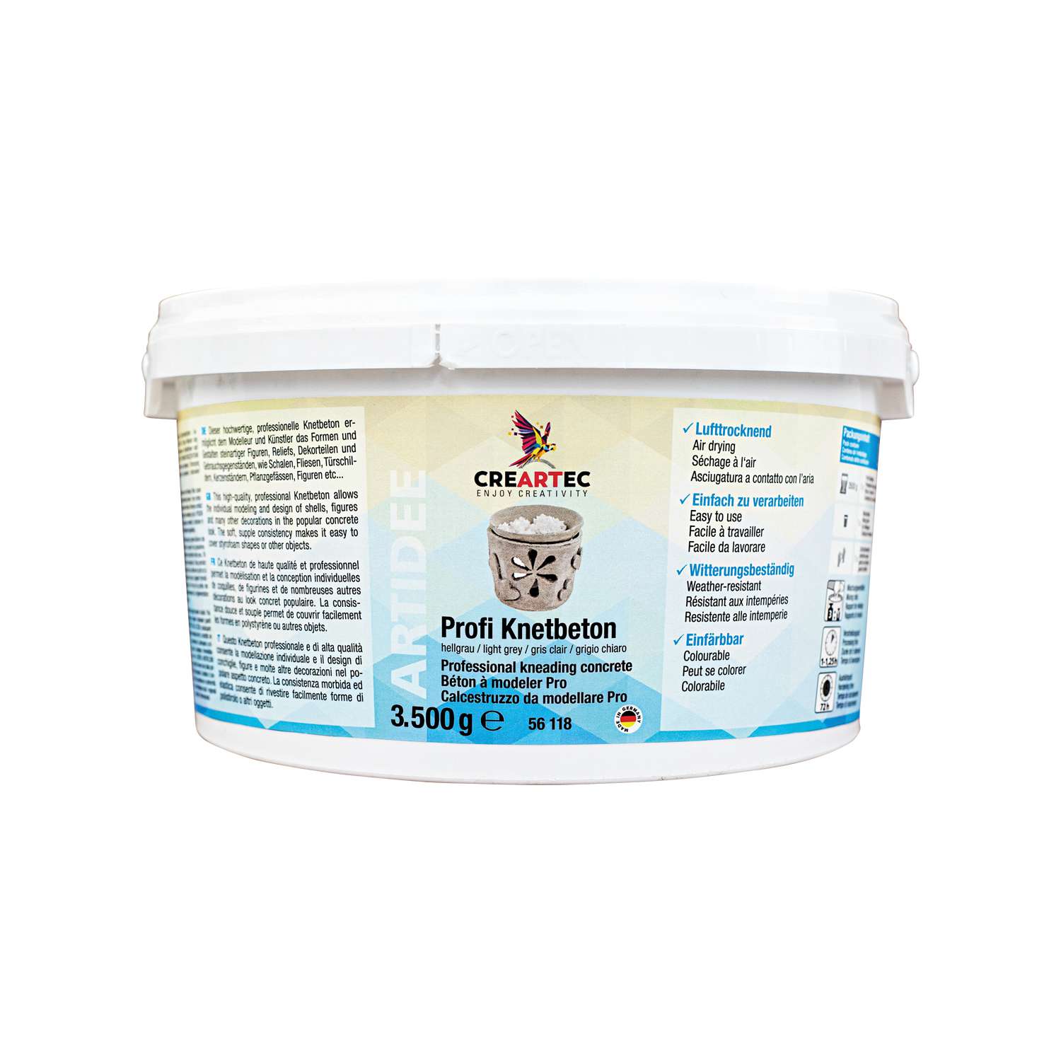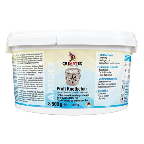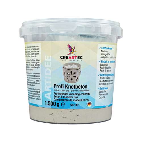 El hormigón para modelar Creartec Profi Artidee es una pasta para modelar de alta gama y de color gris claro, que se trabaja como la arcilla y adquiere después del secado la contextura y la solidez del hormigón. Su consistencia flexible permite un modelado limpio, sin migajas, lo que lo hace perfectamente apto para la realización de figurinas, relieves, objetos decorativos, elementos para joyas o bricolaje tanto en interiores como en exteriores.