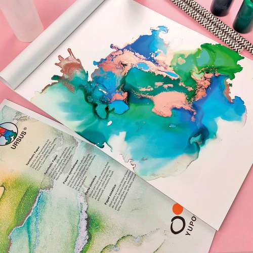 El papel sintético "transparente" Ursus es ideal para las tintas a base del alcohol, técnicas mixtas, acuarela, pintura acrílica u óleo, pero también con rotuladores, tinta, bolígrafos y rotuladores de pincel.
