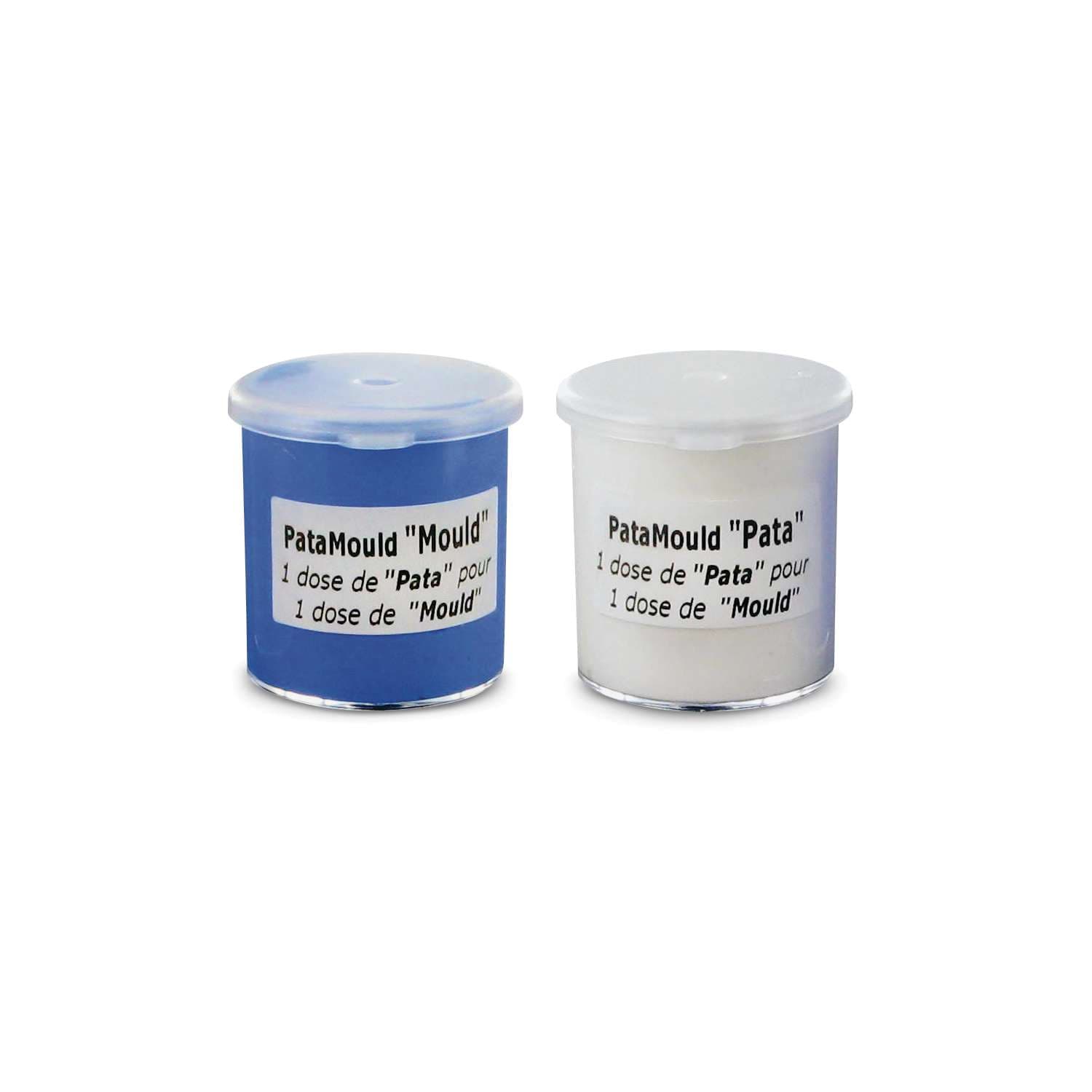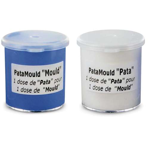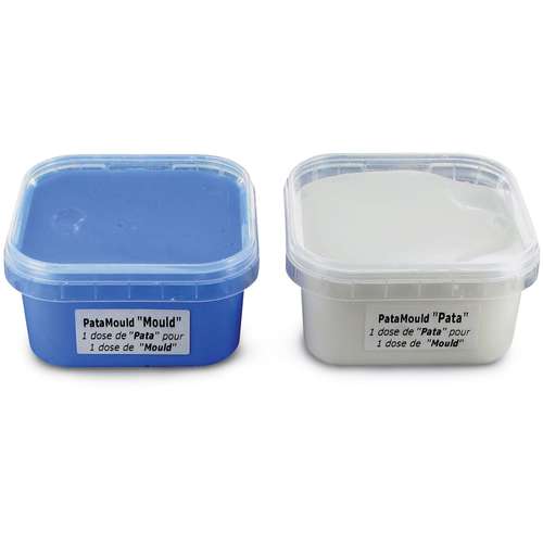 La pasta para moldes de silicona Patamould Cléopâtre contiene dos componentes, uno azul y otro blanco que permiten crear moldes en 5 minutos.