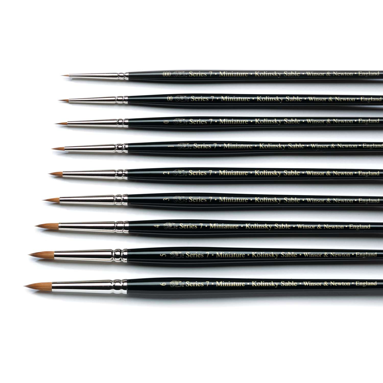 Pelo de marta roja Kolinsky. Mango corto y punta fina. Idóneo para los detalles y retoques. Disponible en 9 tamaños. El mejor pincel para acuarela del mundo. Las normas de calidad de este pincel fueron establecidas en 1866 cuando su Majestad la Reina Victoria dio el orden a Winsor & Newton producir unos pinceles para acuarela de excelencia en su tamaño preferido, el tamaño numero 7. Ahora, le Serie 7 está fabricada con la más pura calidad de pelo de marta Kolinsky, con mangos anticorrosión pulidos negros y montados en virolas sin soldaduras, bisel de níquel inoxidable. La Serie 7 aprovecha materias primas de la más alta calidad y está totalmente hecho a mano por los maestros pinceleros de Winsor & Newton, beneficiándose de todos sus años de experiencia. Para los mayores tamaños, cada pincel esta embalado a parte en una caja con una etiqueta que lleva el nombre de la persona que fabrico este pincel tan particular que hace parte de la serie 7. La Serie 7 cumple con los requisitos de calidad esenciales del más fino de los pinceles para acuarela concebido por los artistas. Estas calidades son: Punta – el pincel acaba en una punta nítida que no cambia cuando se pinta Memoria de forma – el pincel recobra firmemente su forma inicial, con exactamente el mismo grado de firmeza que le permite al artista una control perfecto entre el pincele y la superficie que punta. Control de la fluidez – el color se extiende de manera uniforme y constante a partir de la punta. Tiene suficientemente capacidad de absorción del color a nivel del cuerpo para permitir la aplicación de trazos amplios y fluidos. Para los artistas exigentes en lo que concierne la calidad y durabilidad. La Serie 7 es única. Ahora, como en el año 1866, la Serie 7 está hecha para los que comprenden que la calidad de la obra es el reflejo de la calidad del pincel. Precio por pincel.