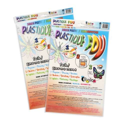 El plástico loco se encoge en el horno hasta 7 veces en todas las dimensiones. El resultado es un objeto rígido. Material ideal para la realización de originales llaveros, por ejemplo.