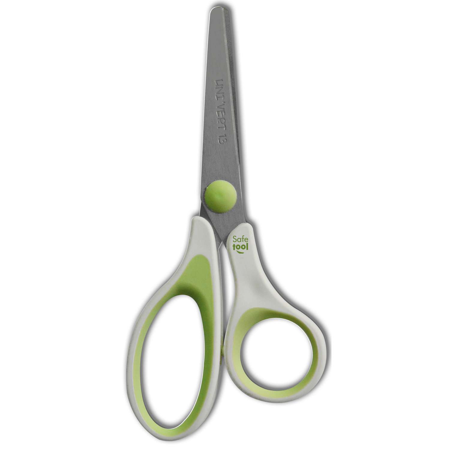 Tijeras con hojas de acero inoxidable. Puntas redondas. Anillos asimétricos, biodegradables y reciclables.